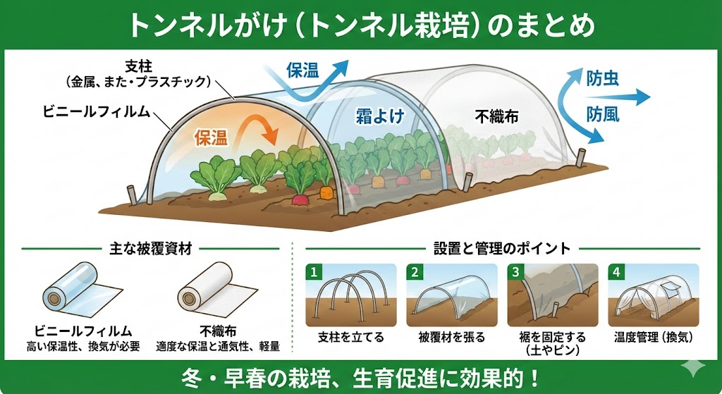トンネル栽培の成否は、いかに**「風で飛ばされない頑丈な構造を作るか」と「適切な温度管理ができるか」**にかかっています。